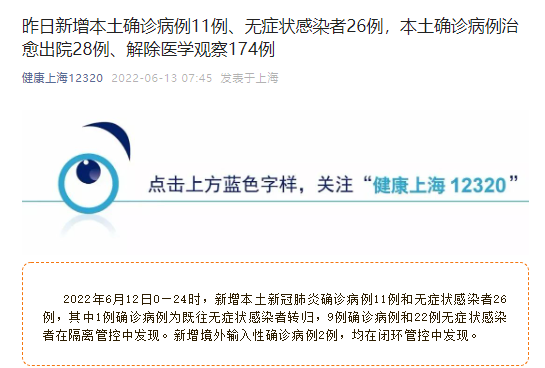 2022年6月12日0—24时,上海新增本土新冠肺炎确诊病例11例和无症状感染者26例,其中1例确诊病例为既往无症状感染者转归,9例确诊病例和22例无症状感染者在隔离管控中发现。新增境外输入性确诊病例2例,均在闭环管控中发现。