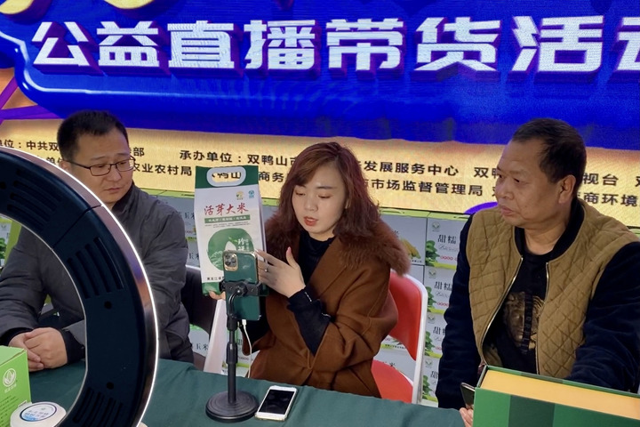 在黑龙江省双鸭山市电子商务发展服务中心,“带货”主播在直播间推介农产品。 新华社记者 刘赫垚 摄