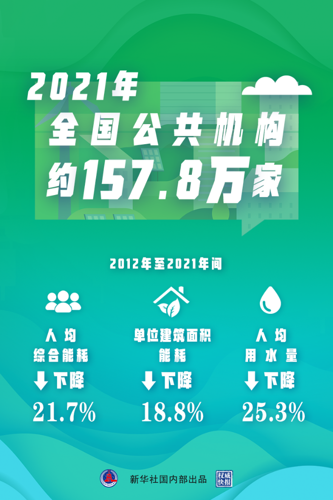 新华社北京6月13日电(记者范思翔)据初步统计,2021年全国公共机构人均综合能耗、单位建筑面积能耗、人均用水量与2012年相比分别下降21.7%、18.8%、25.3%。