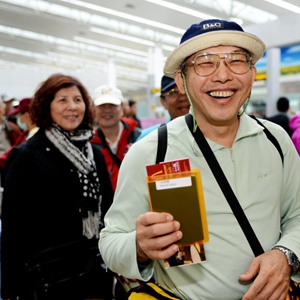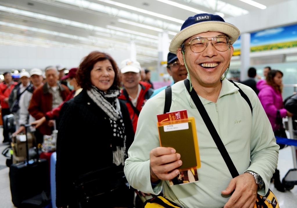 2013年12月15日,乘两岸直航班机飞往台中的台胞王先生在福州机场办理登机手续。新华社记者 张国俊 摄