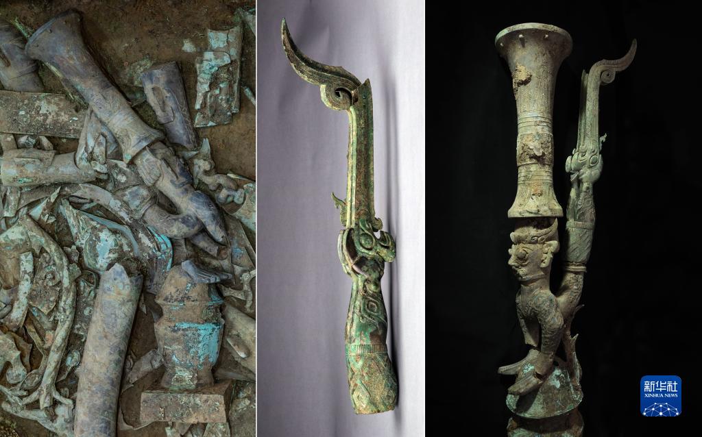 这是一张拼版照片:左为6月1日在四川省广汉市拍摄的三星堆遗址8号“祭祀坑”新发现的顶尊蛇身铜人像(新华社记者 沈伯韩 摄);中为6月15日拍摄的1986年2号“祭祀坑”出土的青铜鸟脚人像残部(三星堆博物馆供图);右为6月15日拍摄的拼对成功的鸟足曲身顶尊神像(鲁海子 摄)。