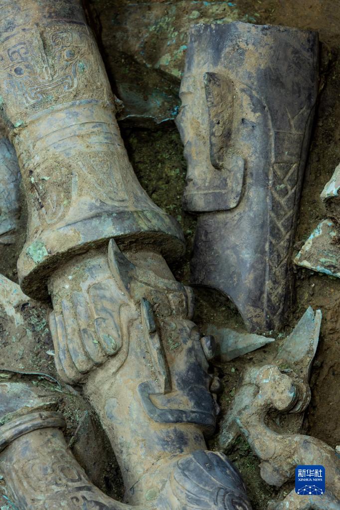 在四川省广汉市拍摄的三星堆遗址8号“祭祀坑”新发现的顶尊蛇身铜人像局部(左)(6月1日摄)。