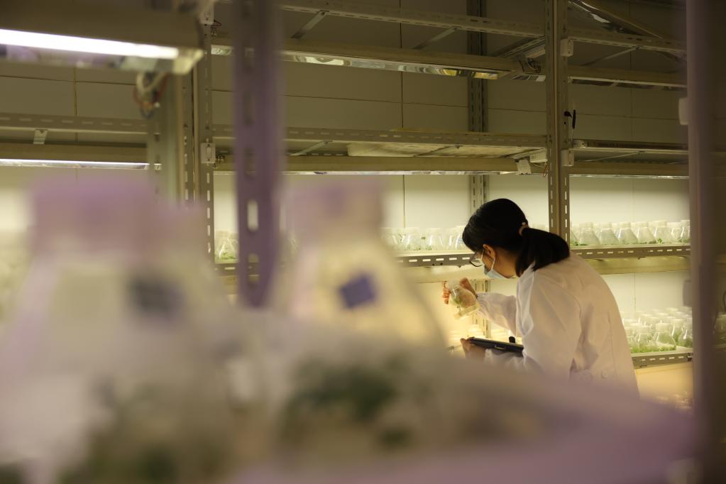 6月4日,毛英在组培室查看培养基内丁香繁育情况。(新华社记者李宁 摄)