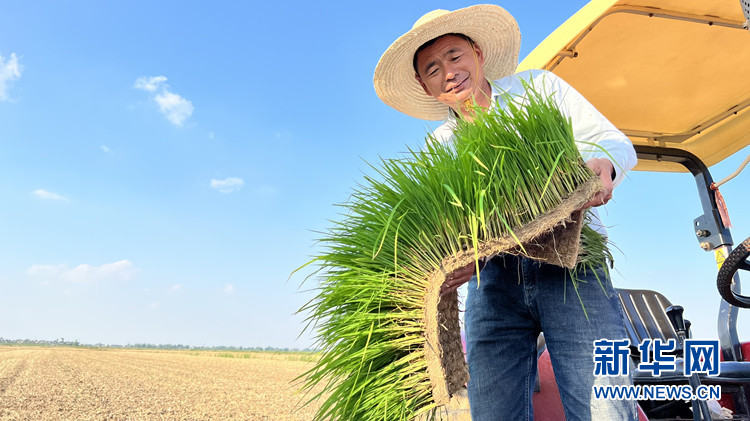颍上县种粮大户罗应地仔细端详自家育的秧盘。新华网发(徐红梅 摄)