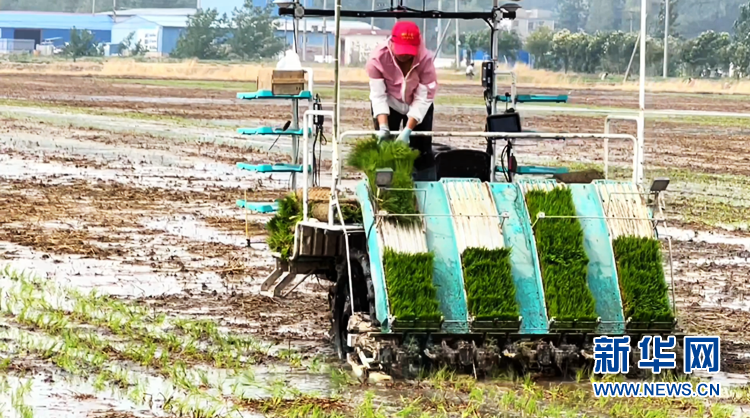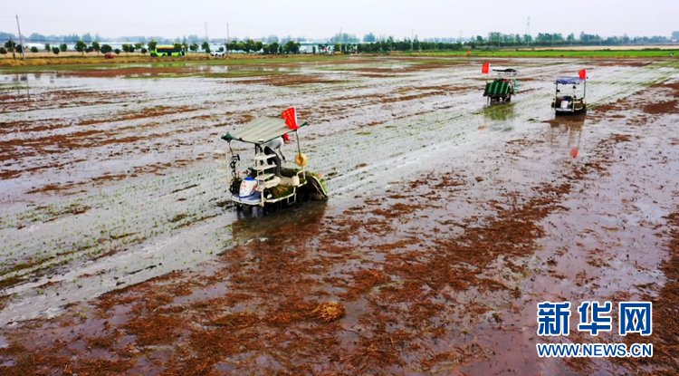 无人驾驶插秧机在田间作业。新华网发(徐红梅 摄)