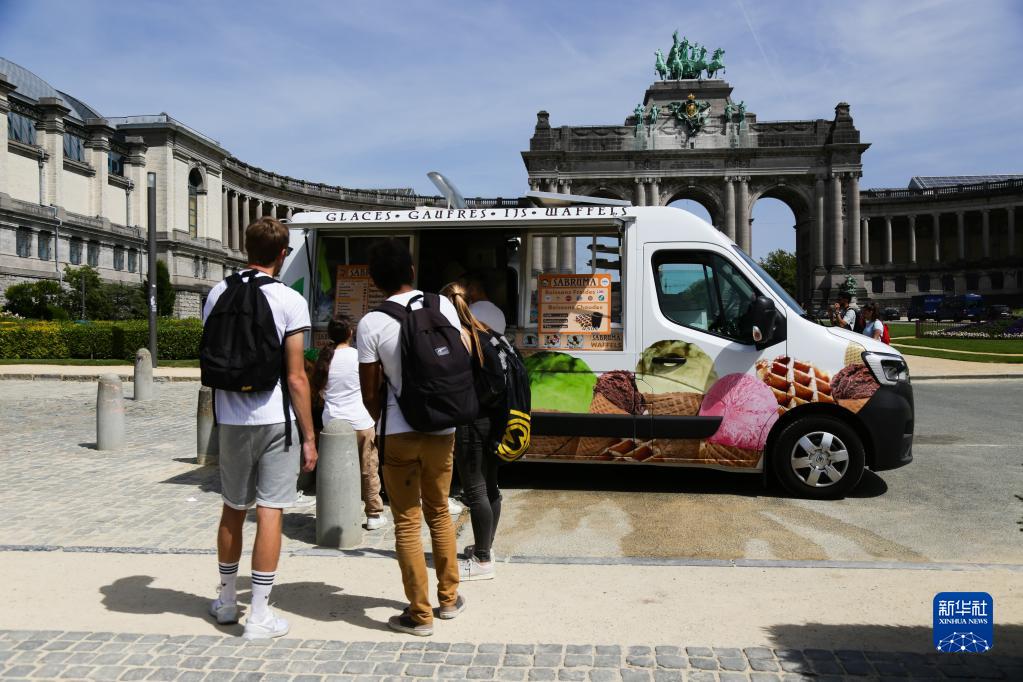 6月17日,人们在比利时布鲁塞尔五十周年纪念公园排队购买冰淇淋。