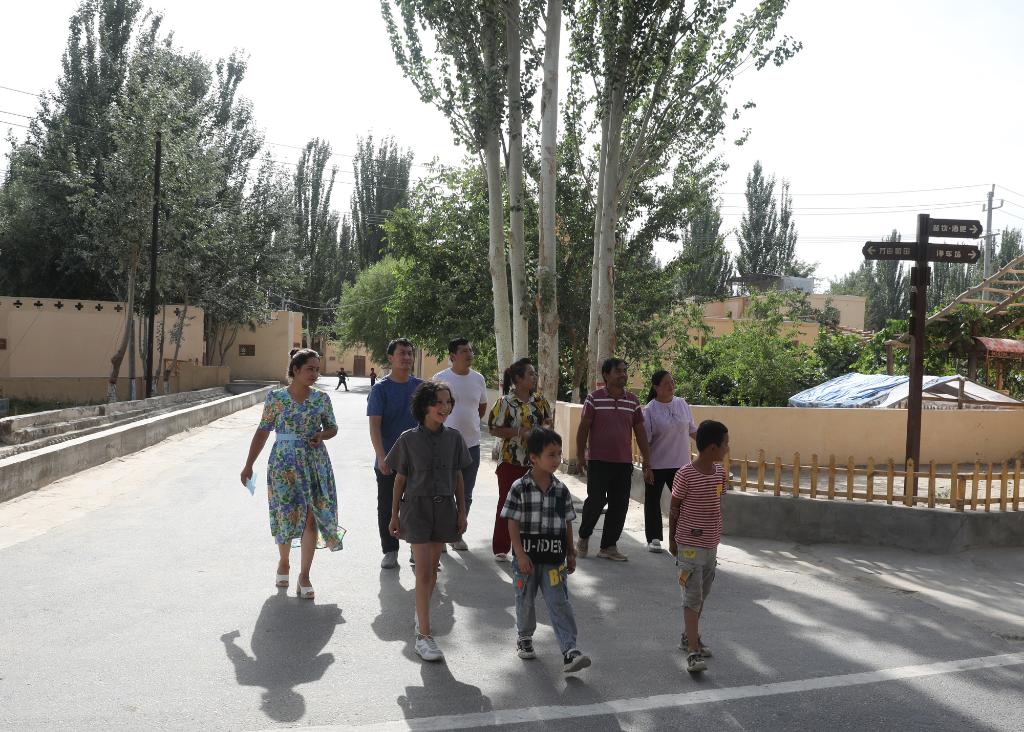 在和田县罕艾日克镇稻香村、和田市古江巴格乡托万特根拉村,道路四通八达,村道两旁家家户户把围墙拆掉或矮化,修葺一新的和田传统“阿依旺”风格民居、葡萄架、菜地、果园尽收眼底,村民们利用自家房屋操办起特色餐饮、农家乐、乐器店、绣坊、民宿等旅游项目。