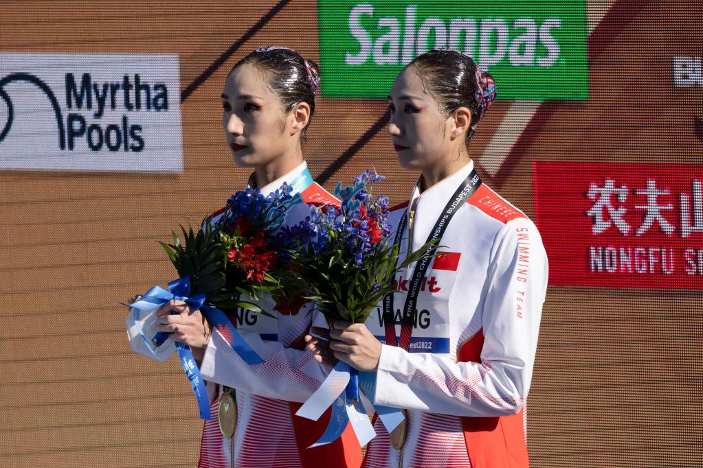 双人技术自选决赛共有12对选手参加,王柳懿、王芊懿这对25岁的双胞胎姐妹第七个出场,她们的精彩表现赢得现场观众的热烈掌声。最终,王柳懿、王芊懿以总分93.7536获得冠军。
