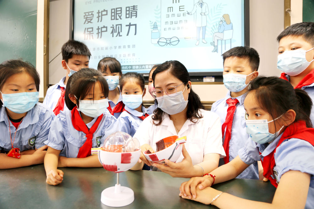 ↑在江苏省连云港市院前小学,校医为学生讲解保护眼睛的常识(2022年6月6日摄)。