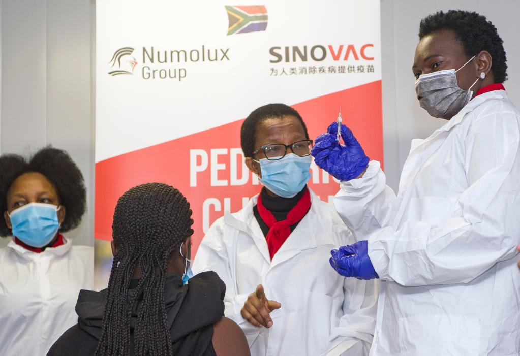 2021年9月10日,南非医务人员在比勒陀利亚为参加临床试验的青少年注射中国科兴公司生产的新冠疫苗。(新华社记者陈诚摄)