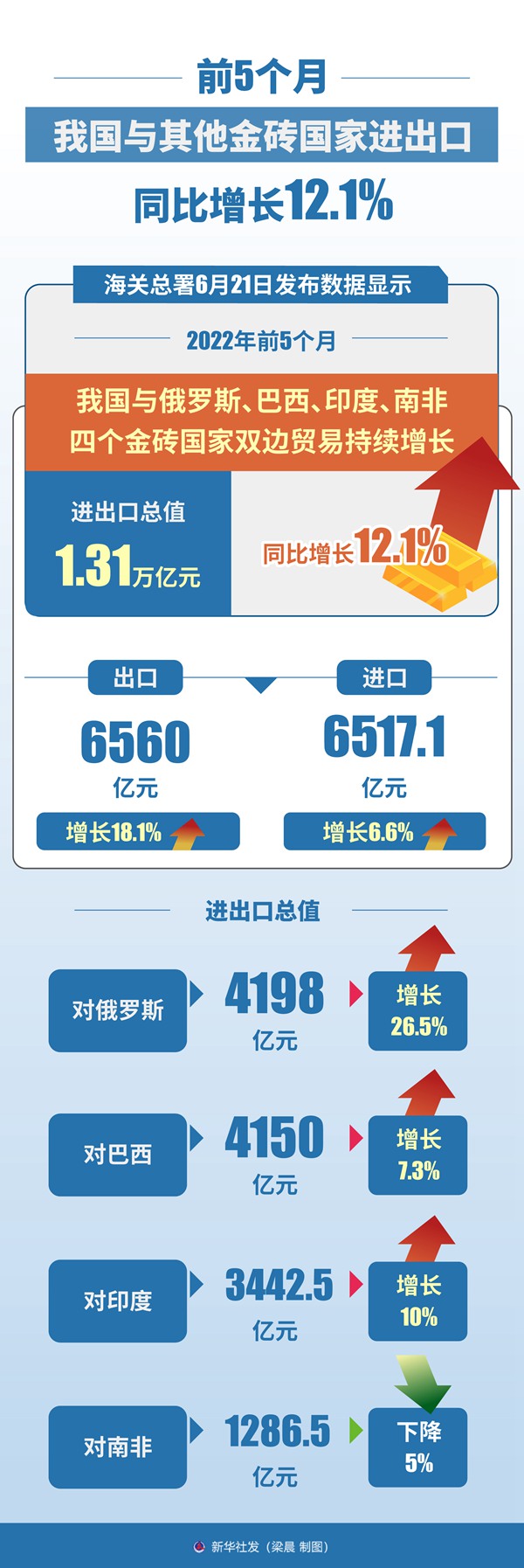 新华社北京6月21日电(记者邹多为)海关总署21日发布数据显示,今年前5个月,我国与俄罗斯、巴西、印度、南非四个金砖国家双边贸易持续增长,进出口总值1.31万亿元,同比增长12.1%,高出同期我国外贸整体增速3.8个百分点。