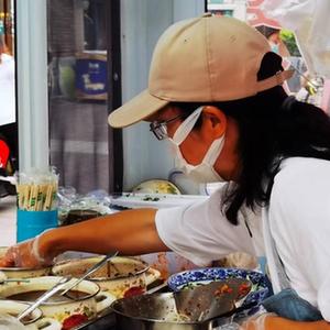 摊主朱艳一边招呼着客人,一边在案板上飞快地切凉皮、擦黄瓜丝,再拌上香喷喷的花生碎和芝麻盐,加上筋道的面筋、爽口鲜脆的豆芽,最后浇上一早调制好的各种料汁。