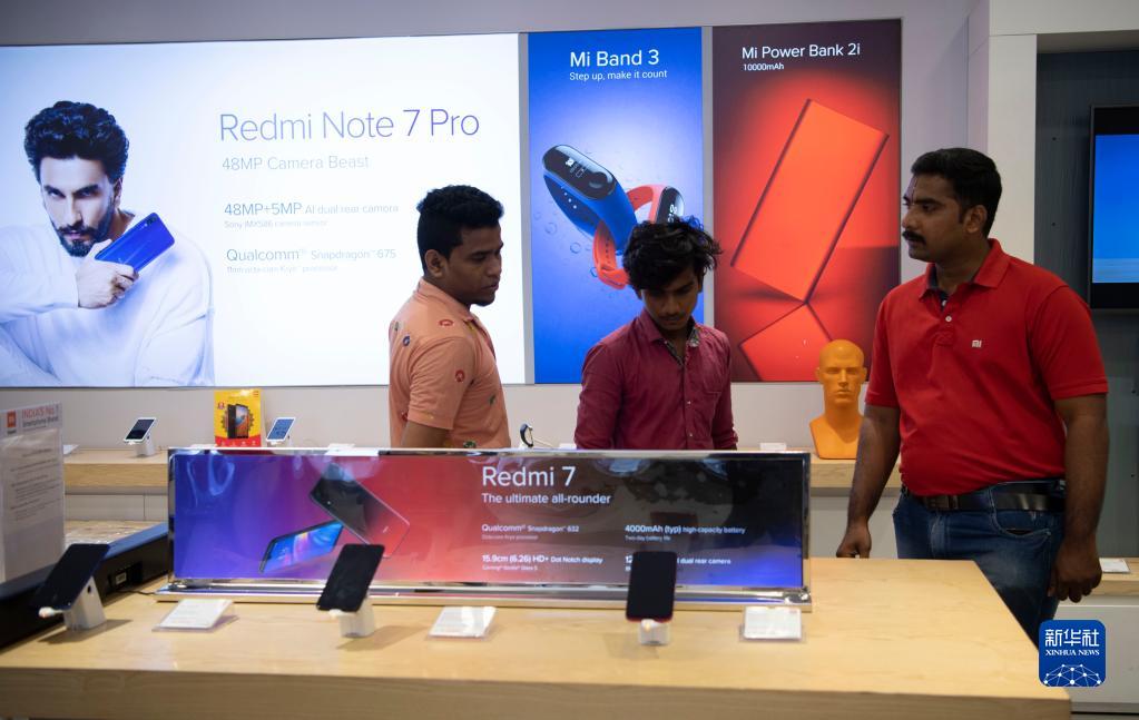 这是2019年10月8日,人们在印度金奈一家商场的中国品牌小米门店购买手机。新华社记者 吕小炜 摄