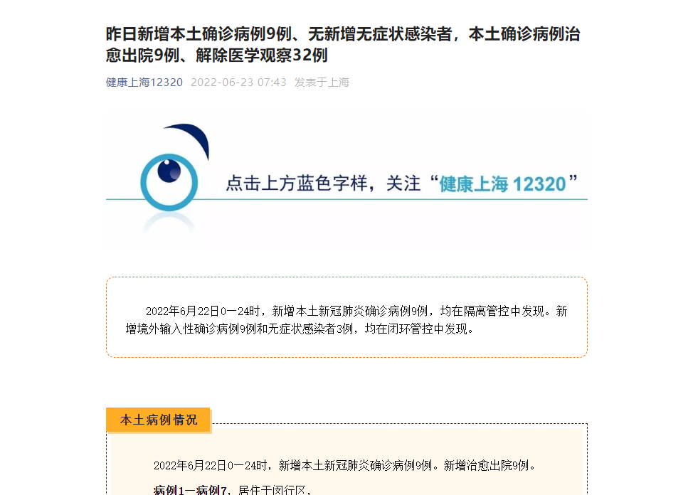 2022年6月22日0—24时,上海新增本土新冠肺炎确诊病例9例,均在隔离管控中发现。新增境外输入性确诊病例9例和无症状感染者3例,均在闭环管控中发现。