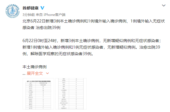 北京6月22日新增3例本土确诊病例和1例境外输入确诊病例、1例境外输入无症状感染者 治愈出院39例