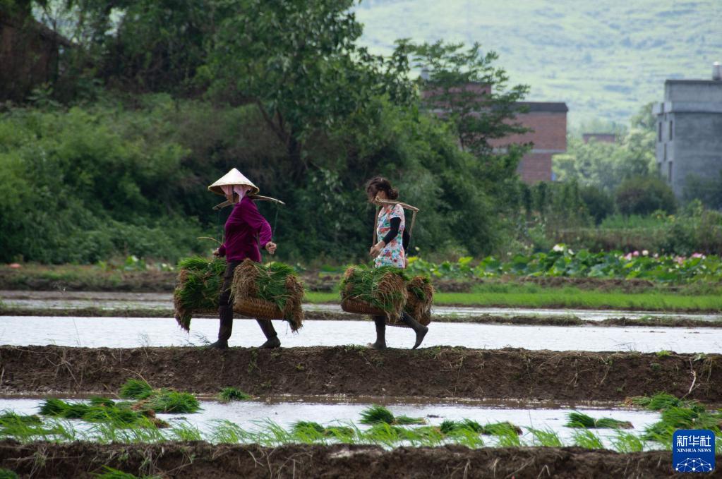 6月23日,在湖南省衡阳市耒阳市仁义镇十里村,当地村民在运送秧苗。