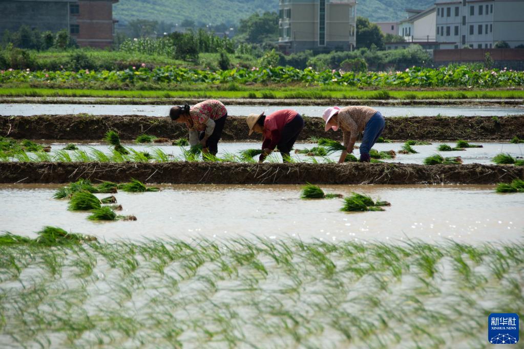 6月23日,在湖南省衡阳市耒阳市仁义镇十里村,当地村民抢抓农时种中稻。