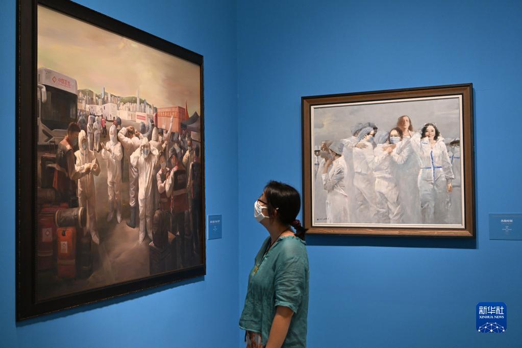 6月24日,参观者在展览上观看作品《逆行出征 同心守护》。 新华社记者 李鑫 摄