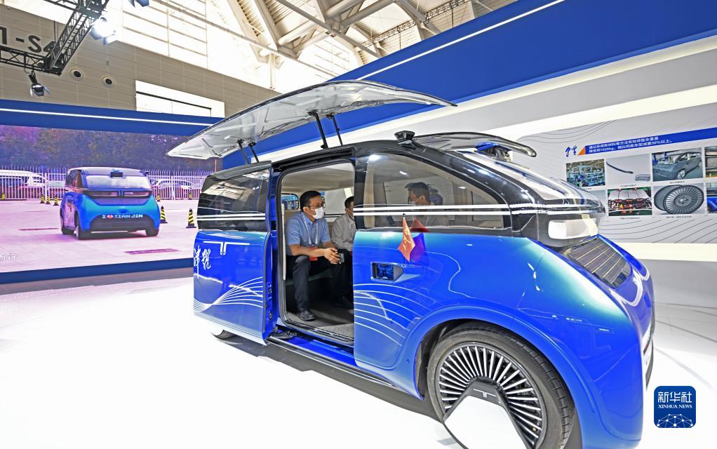 6月24日,在第六届世界智能大会天津制造业立市展上,参会嘉宾体验“天津号”纯太阳能汽车。 新华社记者赵子硕摄