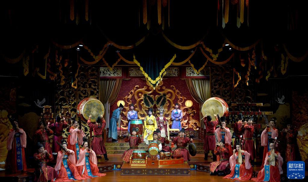 在西安大唐芙蓉园拍摄的融合了大唐乐舞和东仓鼓乐创新而成的舞台剧《鼓》(6月23日摄)。新华社记者 刘潇 摄