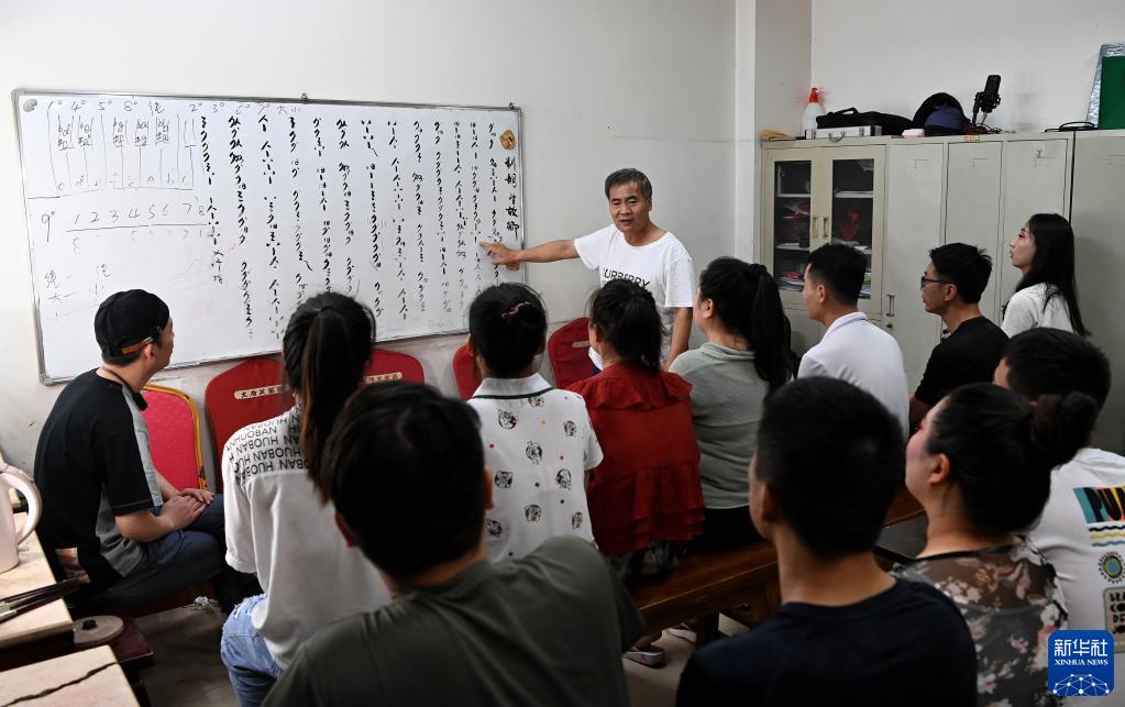 6月23日,西安东仓鼓乐社乐师在给乐手们韵曲《望故乡》。新华社记者 刘潇 摄