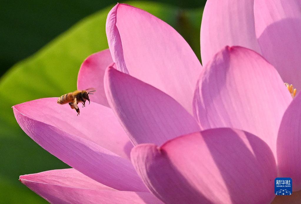 6月21日,在河北省邯郸市龙湖公园的荷塘,蜜蜂在花间飞舞。