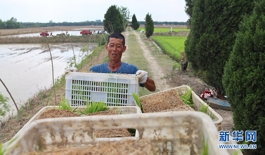 6月22日,在安徽省合肥市肥西县上派镇金岗村,农民在搬运水稻秧苗。