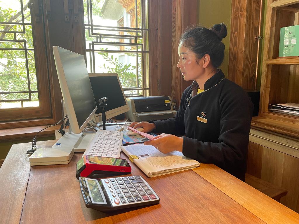 云南维西县塔城镇松赞塔城酒店负责人古丽英在操作电脑。(新华社记者杨静摄)