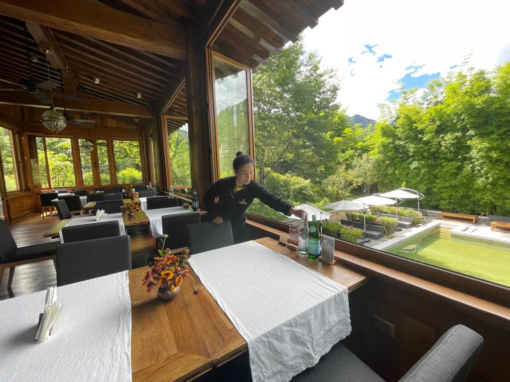 云南维西县塔城镇松赞塔城酒店负责人古丽英在整理餐桌。(新华社记者杨静摄)