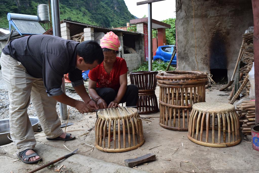 翁达村党总支书记俸绍春介绍,他们建立“支部+合作社+基地+农户”的产业模式,创建民族产业示范户,辐射带动约100户群众编制藤篾鼓凳。