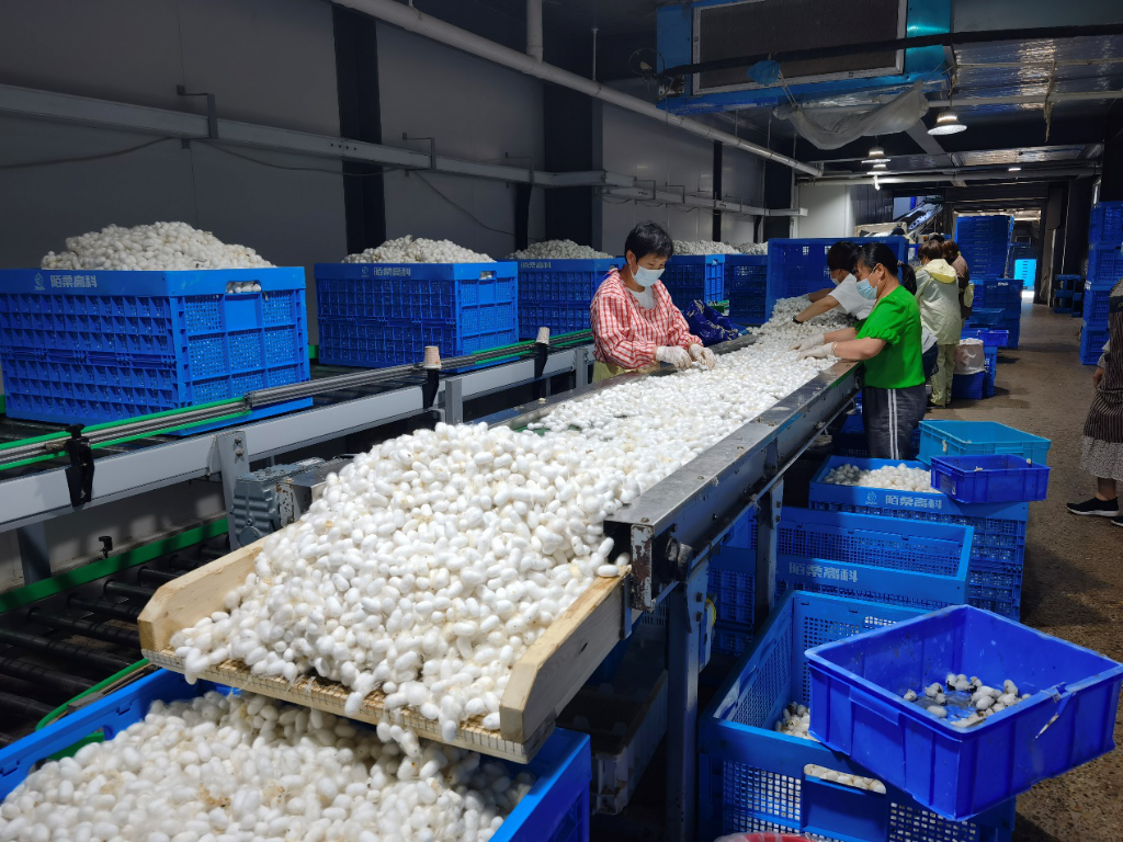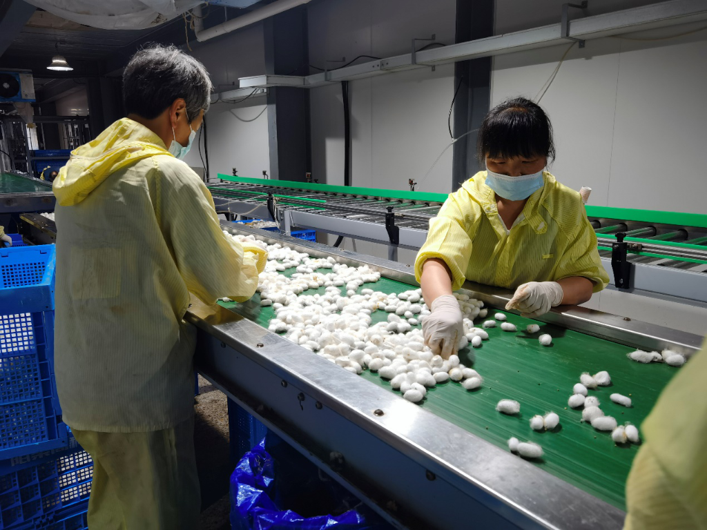 清晨,巴贝集团的养蚕项目工厂里一派忙碌景象,一袋袋均匀、饱满的蚕茧被卡车拉走,进入市场。何锐敏告诉记者:“每天都有车来,我们日产的20吨鲜茧直接被拉走,供不应求。”
