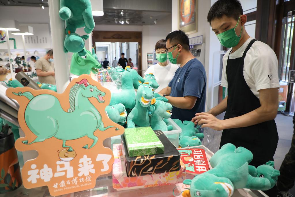 6月28日,在甘肃省博物馆文创商店,工作人员摆放“马踏飞燕”主题玩偶。(新华社记者 马希平 摄)