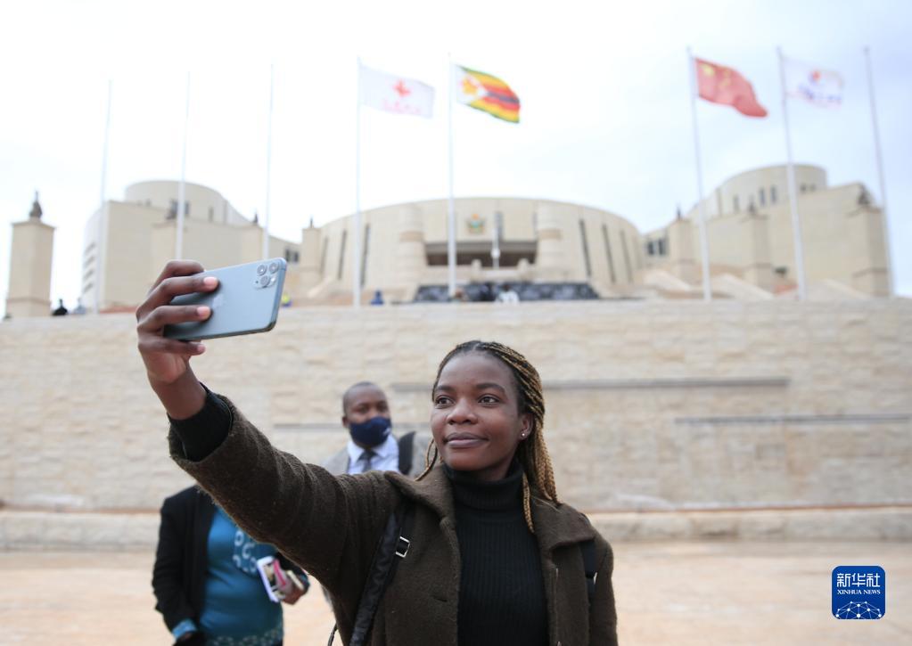 6月29日,在津巴布韦汉普登山新城,一名女子在新议会大厦前留影。新华社发(肖恩·朱萨 摄)