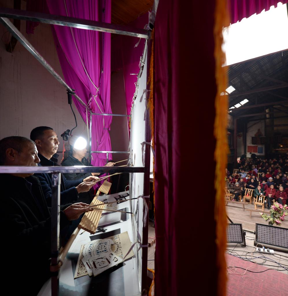 在湖南省浏阳市沙市镇秧田村,宋伟军(左二)和剧团成员表演皮影戏(2021年11月16日摄)。新华社记者 陈振海 摄