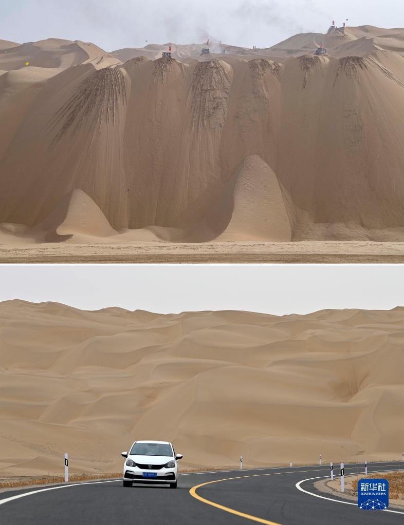 拼版照片:上图为2020年5月17日拍摄的尉犁至且末沙漠公路施工现场(新华社记者胡虎虎摄);下图为2022年6月24日在尉犁至且末沙漠公路同一路段拍摄的工作车辆在路面行驶(无人机照片,新华社记者李响摄)。新华社发