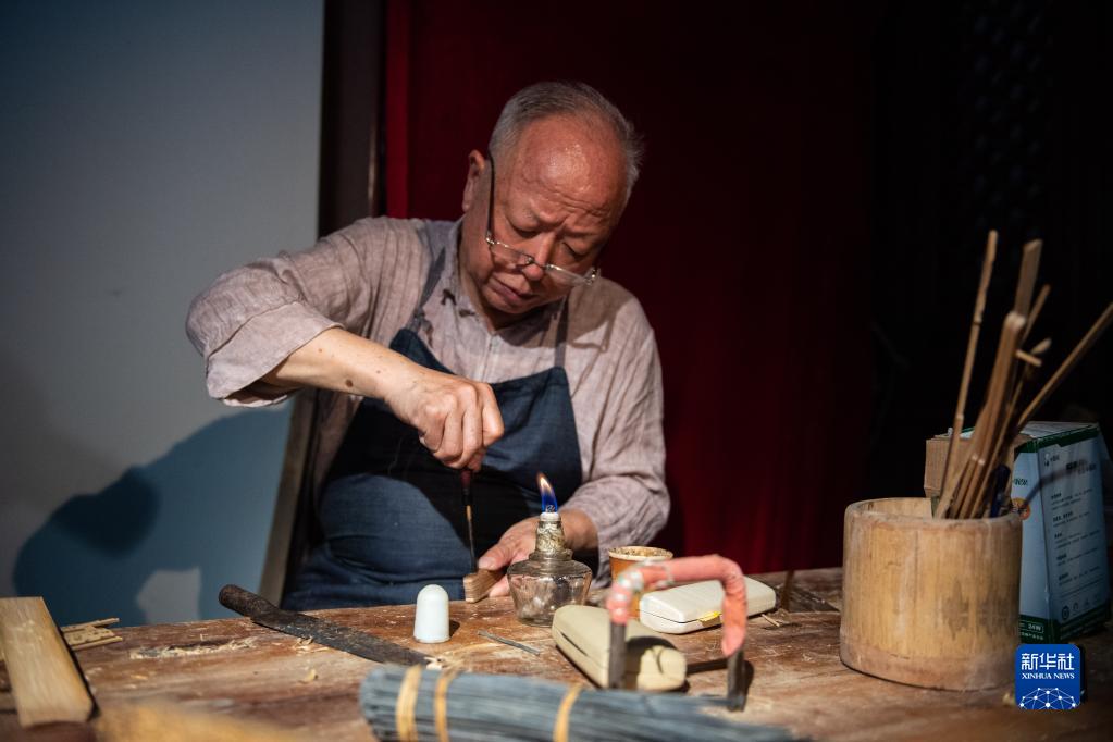 6月23日,在岳阳市巴陵扇社,刘正文在烫牛角钉。