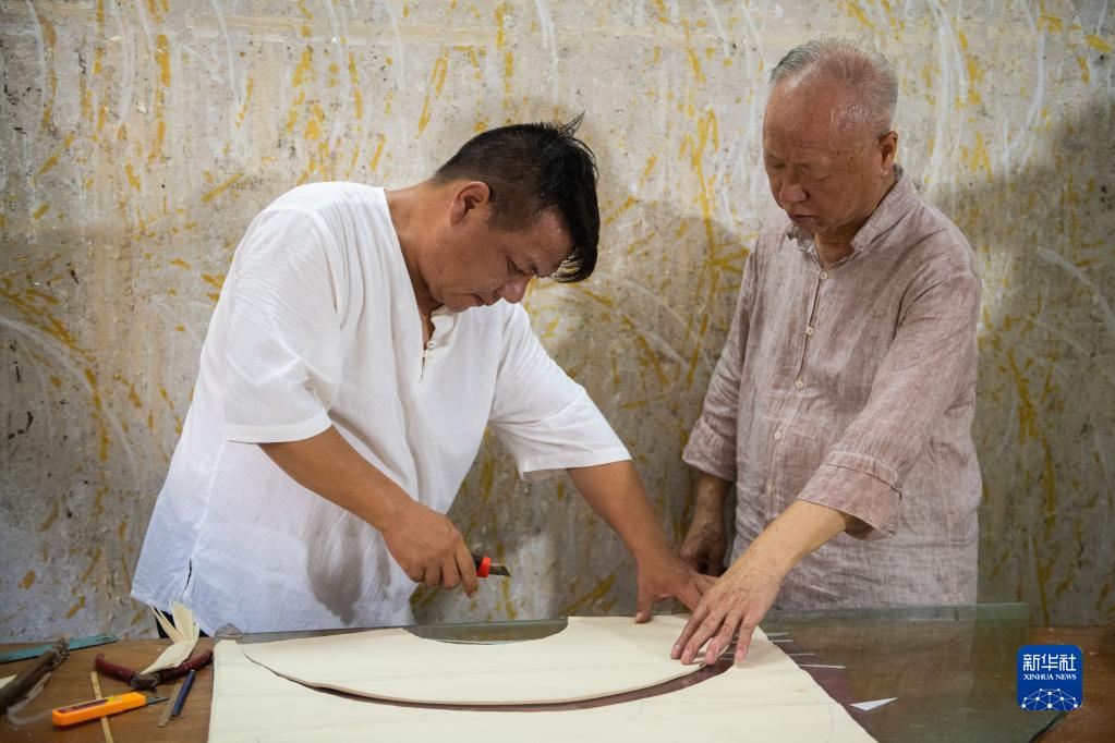 6月23日,在岳阳市巴陵扇社扇面制作区,刘正文(右)和儿子刘岳军在裁剪扇面。