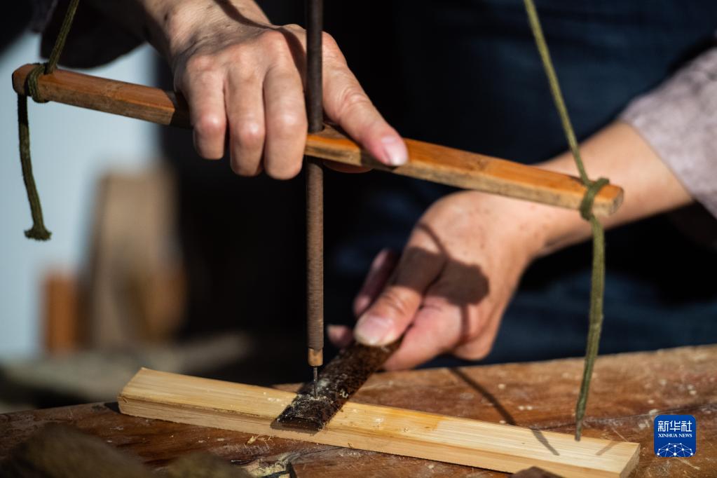 6月23日,在岳阳市巴陵扇社,刘正文为扇子边骨钻眼。