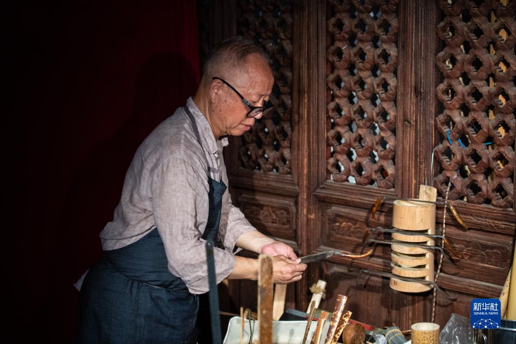 6月23日,在岳阳市巴陵扇社,刘正文取制作扇骨的工具。