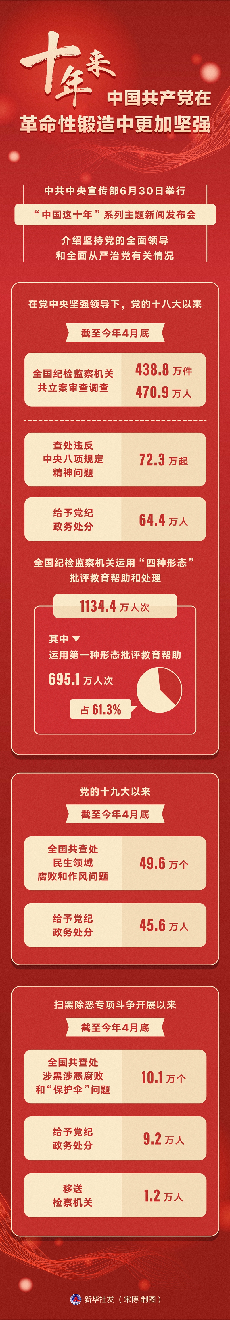 新华社北京6月30日电(记者张研、孙少龙)中共中央宣传部30日举行“中国这十年”系列主题新闻发布会,介绍坚持党的全面领导和全面从严治党有关情况。中央纪委国家监委宣传部部长王建新表示,十年浴火淬炼,全面从严治党政治引领和政治保障作用充分发挥,管党治党宽松软状况得到根本扭转,我们党在革命性锻造中更加坚强。