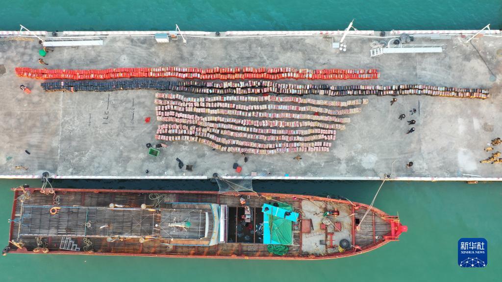 这是海警查获的走私香烟与涉案船只(2020年12月31日摄,无人机照片)。新华社发