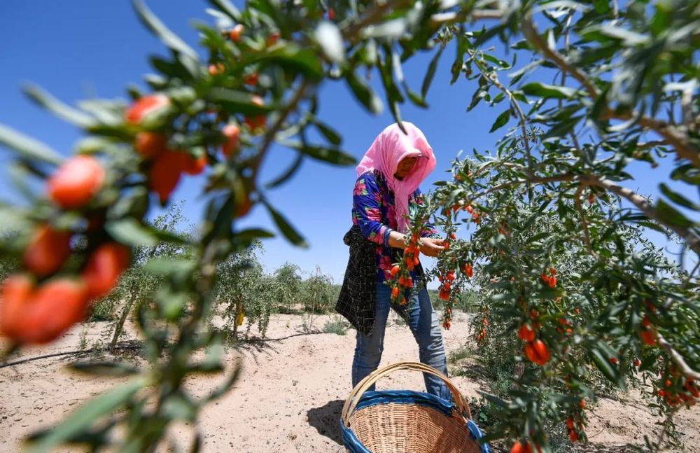 2020年6月5日,农民在宁夏吴忠市红寺堡区百瑞源原生态枸杞种植基地采摘头茬枸杞 冯开华摄 / 本刊