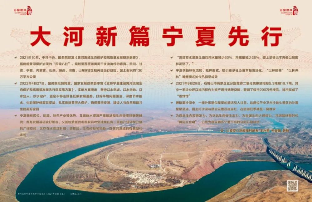 ◆ 2022年4月27日,国务院批复同意,国家发展改革委印发《支持宁夏建设黄河流域生态保护和高质量发展先行区实施方案》。实施方案提出,坚持以水定城、以水定地、以水定人、以水定产,坚定不移走绿色低碳发展道路,打好环境问题整治、深度节水控水、生态保护修复攻坚战,扎实推进黄河大保护,确保黄河安澜,建设人与自然和谐共生的美好家园