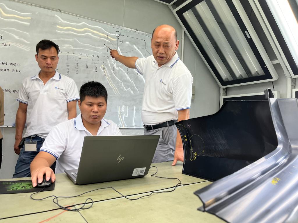 这是古显善(右一)与技术团队讨论模具制作图调整方案。新华社记者 赵瑞希摄