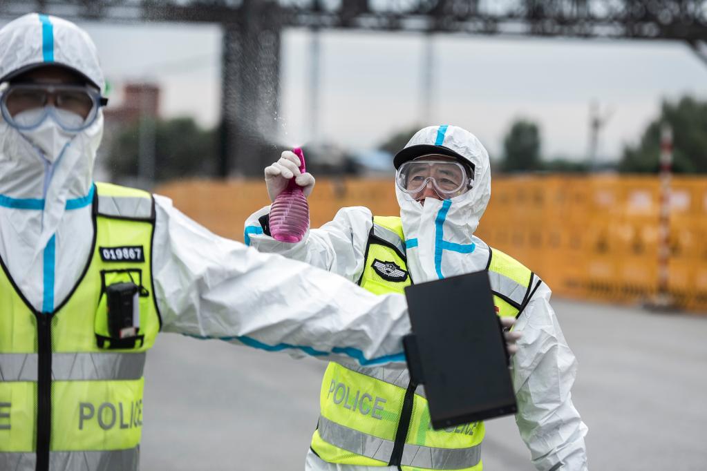 这是黑龙江省哈尔滨市公安局香坊分局瓦盆窑公安检查站中队长魏玉刚(右一)在高速路卡口执勤。(受访者供图)