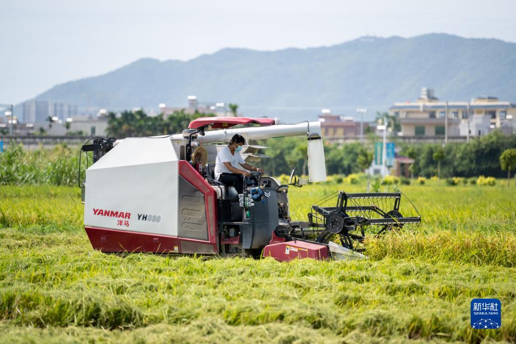7月4日,在三亚市崖州区(坝头)南繁公共试验基地,农机手在收割水稻。