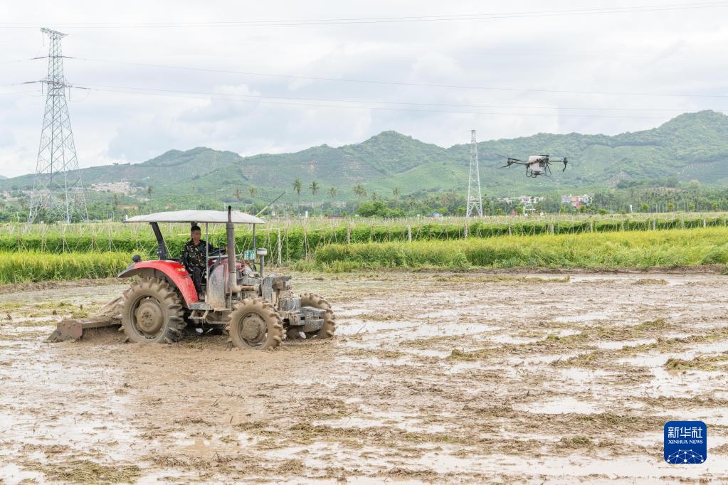 7月4日,在三亚市崖州区(坝头)南繁公共试验基地,农机手在对无人机播撒的绿肥种子进行覆土作业。