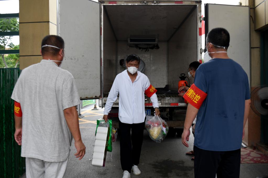 7月4日,安徽泗县玉兰小区的工作人员接收居民的订单物资。新华社记者 黄博涵 摄