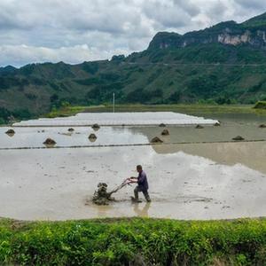 4月25日,重庆市酉阳县花田乡,稻农在水田里使用小农机进行劳作(无人机照片)。新华社记者 唐奕 摄