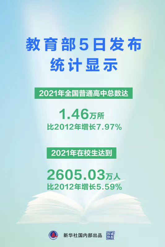 教育部5日召开新闻发布会介绍,十年来,我国高中阶段教育普及水平显著提升。2021年全国普通高中总数达1.46万所,在校生达到2605.03万人,分别比2012年增长7.97%和5.59%,为更多适龄学生提供了接受普通高中教育的机会。